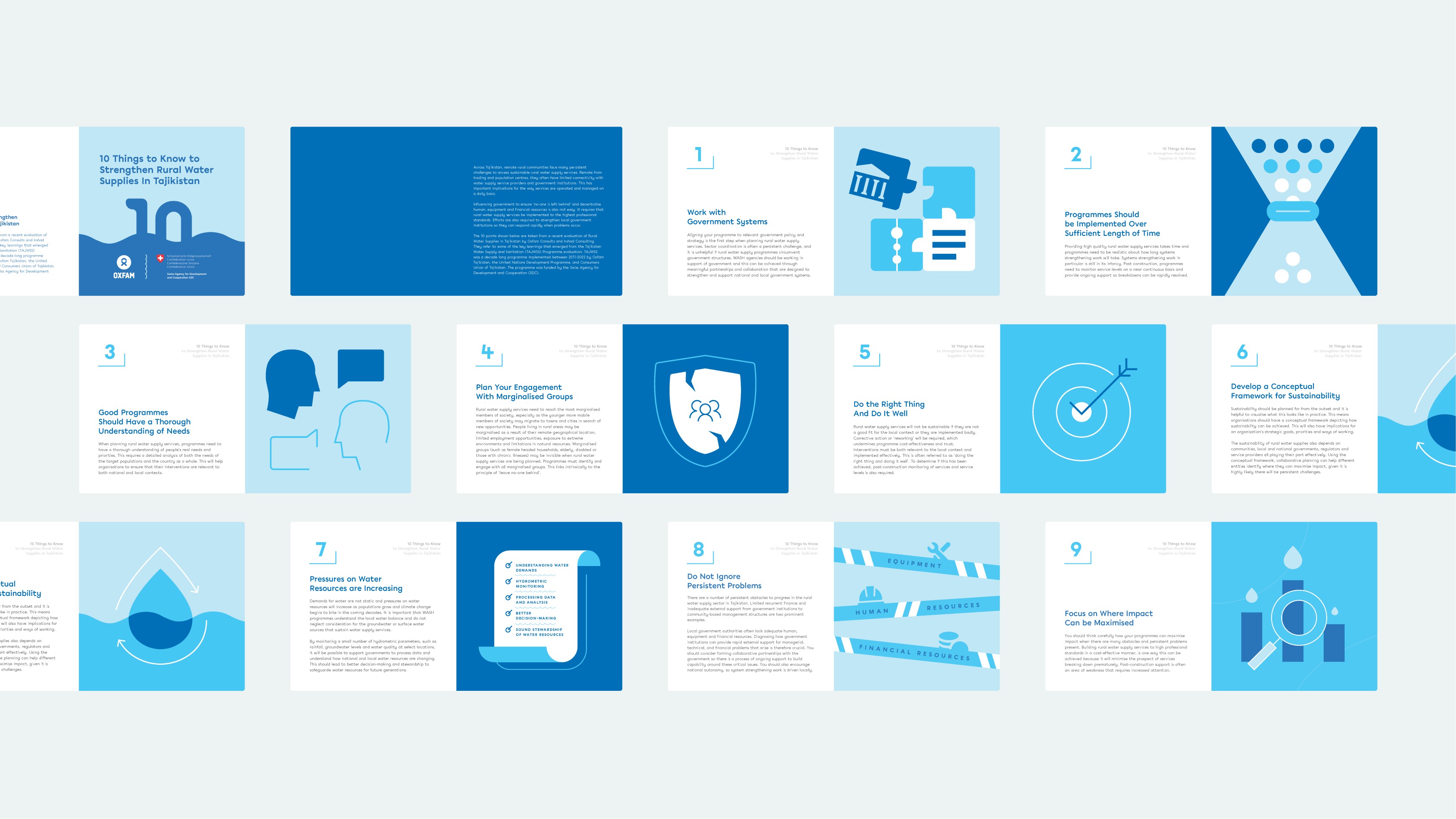 We designed a structured instruction booklet covering the programme's key learnings, with a custom illustration system built for each section. Every illustration was functional — designed to visualize the core idea of its corresponding guideline, not to decorate it. Governance models, community ownership frameworks, demand-driven design principles: each given a visual language that made the concept immediately legible across language and context.